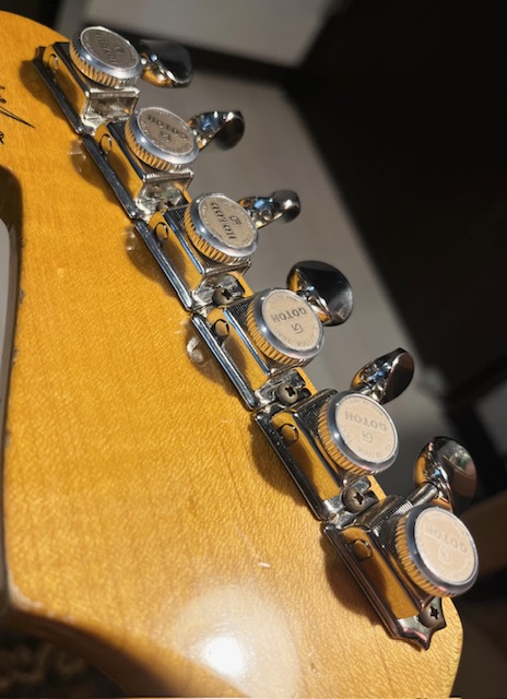 さて新年一発目に紹介するのはギターのペグだよオーライ。コレは最近導入した日本が誇るゴトーのペグ、マグナムロックのトラッドシリーズというものだよ。裏側のダイヤルを回すことで弦をロックするんだけど、これが本当に便利。弦交換が超簡単になるのと、巻き付けないことでチューニングも格段に安定するんだよね。すごいね、流石の精度ですゴトーさん。fender系のギターには基本的に無加工で取り付けられるから、持ってるギターは全部これにしたいと思ってるくらいだよ。まぁデメリットは強いて言うなら見た目かな。でも俺は全然気になんねーわ裏側だし。あとまぁ音も少し柔らかめにはなるんだけど、それもまた良しだしそれを差し引いても有り余るメリットだよね。みんなもぜひ試してみてね。ではまた次号!